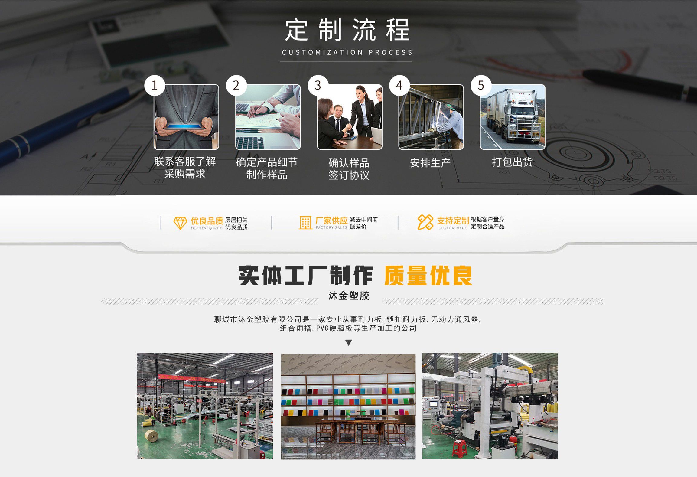 聊城市沐金塑膠有限公司注冊資金2180萬元,占地20000余平方,擁有自建廠房15000平方,員工100余名。10余年來,公司主營耐力板,鎖扣耐力板,耐力板深加工,無動力通風器,組合雨搭,PVC硬脂板,耐力板廠家等板材的發展戰略,逐漸成長為綜合性企業。 公司擁有多條板材共擠生產線,采用世界知名品牌進口原材料和先進工藝,依據完善的ISO9001質量管理體系和ISO14001環境管理體系,為產品的卓越品質提供了強有力的保證。憑借過硬的創新能力和堅實的硬件基礎,贏創已成為國內領先的熱塑性板材生產商,產品被廣泛應用于建筑業、農業、工業、廣告業、安防行業及DIY領域。 公司始終致力于通過提供最優的板材應用解決方案,為客戶創造最高的價值;堅守創新、質量、靈活、服務和速度的核心價值觀;堅持“完美的產品需要完美服務的支持”的經營理念,努力實現成為世界領先的板材與解決方案供應商的夢想。 在未來,公司將立足客戶需求,不斷改變和完善現有產品,拓展產品線和充分開發板材的應用領域,為客戶創造全方位的價值。同時更好地實現員工的價值,實現公司團隊的價值。我們將與您一起創贏未來! 企業使命:成為世界領先的板材與解決方案供應商?! 」驹妇埃和ㄟ^提供最優的板材應用解決方案,為客戶創造最高的價值?! 『诵膬r值觀:質量...